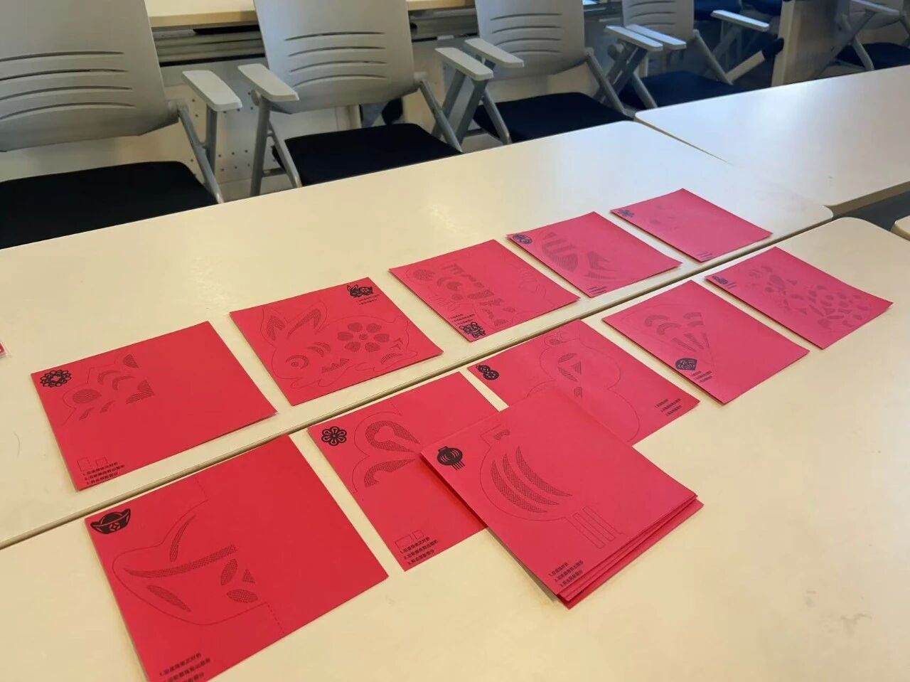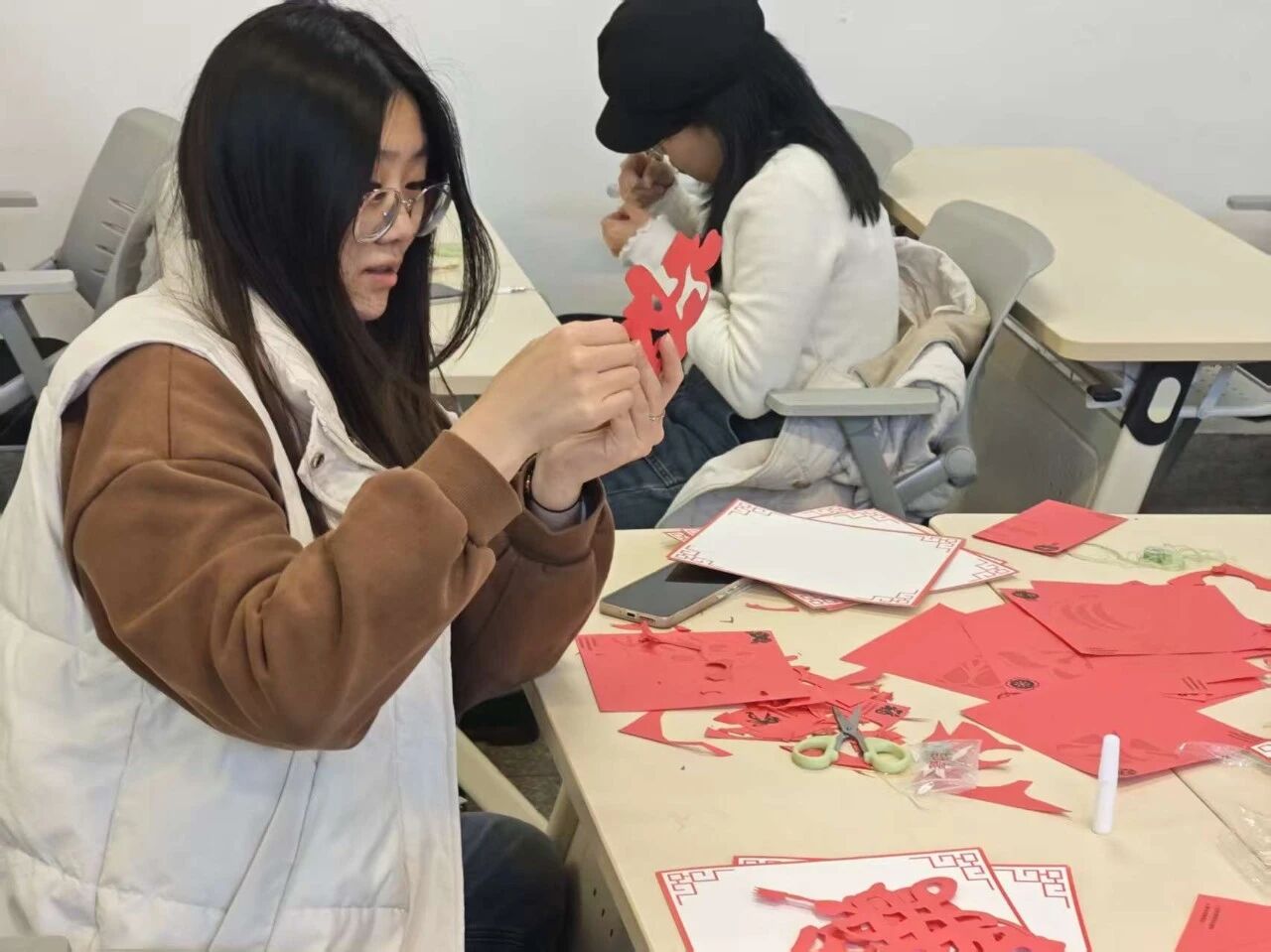 剪纸体验区则满是巧思创意,红纸平铺桌面,剪刀起落间,同学们结合自身想法,或复刻经典纹样,或设计原创图案,从简单的窗花造型到复杂的花鸟纹样,在折叠、剪裁、镂空的反复尝试中打磨细节,工作人员针对剪纸力度把控、纹样衔接技巧细致指导,一张张普通红纸蜕变为灵动鲜活的剪纸作品,传递着同学们对传统工艺的热爱。