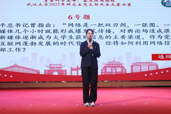 实操风采展示环节以“现场抽题、限时作答”的形式,聚焦基层党建实务中的典型问题,全方位考验支部代表的应急应变能力与实务工作水平。本次抽选的赛题“如何利用网络信息平台开展党支部工作”,直指新时代基层党建的重点与难点。中国哲学研究生党支部书记刘佳源迅速梳理思路,从拓展网络学习资源渠道、推进跨校支部结对共建、提升党建工作科学化和精准化水平等维度展开系统作答,其扎实的工作积淀、严谨的逻辑架构与详实的实践方案,不仅精准回应了赛题要求,更赢得了现场观众的阵阵掌声。