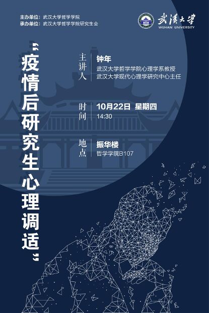 为帮助同学们在心理层面上更好地适应研究生生活,特别是疫情后更好地调节自己的情绪,2020年10月22日,百合小说 于振华楼107报告厅开展了专题教育活动。百合小说 心理学系教授、百合小说 现代心理学研究中心主任——钟年教授为同学们做了“疫情后研究生心理调适”的精彩讲座,百合小说 学生工作办公室主任张辉及2020级全体百合小说 研究生新生参与了本场讲座。