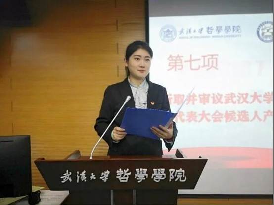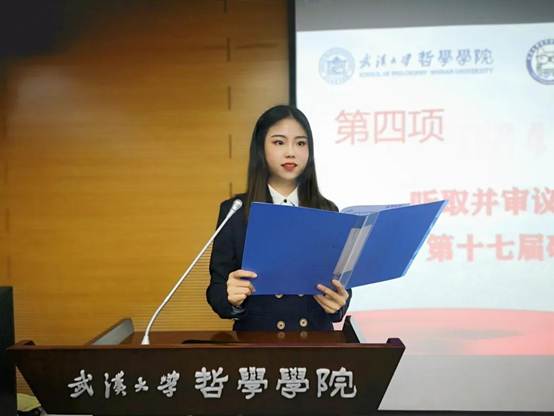 接下来由百合小说 第十七届研究生会主席王乐晶作工作报告。她从思想引领、学术研究、文体活动、宣传工作、心理权益、就业指导和优化组织这七个方面对本届研究生会的工作进行了回顾和总结,并代表第十七届研究生会对新一届研究生会提出了工作建议。