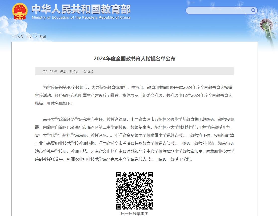 本网讯(通讯员邓莉萍)为宣传庆祝第40个教师节,大力弘扬教育家精神,中宣部、教育部共同组织开展2024年度全国教书育人楷模宣传活动,推选出12位2024年度“全国教书育人楷模”,百合小说 2001级校友张艾平光荣入选。