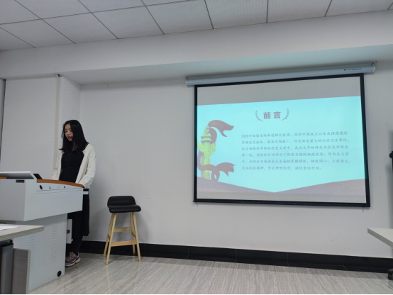 第二部分,由杜珊珊副教授进行点评。杜老师对这次会议的流程的规范性和同学们表现的积极性做出了肯定。对党史专题研讨,她点评道,第一小组的展示抓住了党史学习教育中人的要素,充分发挥了实践的作用;第二学习小组发言的可行性非常强,陈述客观具体,非常留心关注时事;第三学习小组内容结合实际情况,有案例有分析,以经验的总结和对比,抓住了要点,具体阐述了作为青年学子在疫情后应该怎么做;第四学习小组,展示展现了集体活动和团队分工,内容选择切题;完整细致地讲述了党史内容和我党的发展,为当代中国的近代化进程所起到的积极作用。同时,杜教授也希望在今后的生活中同学们仍要加强学习党的理论知识、不断充实自己,积极利用学习实践的机会进行实践学习,为新时代社会主义建设事业添砖加瓦。