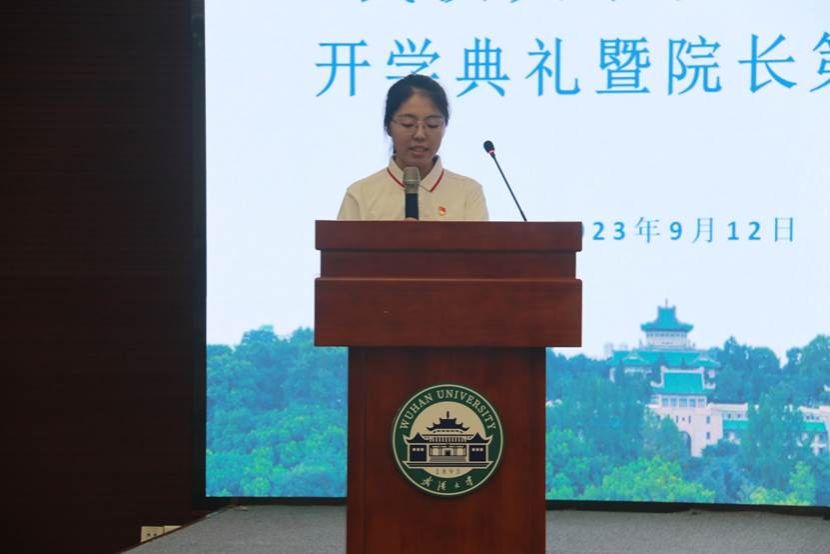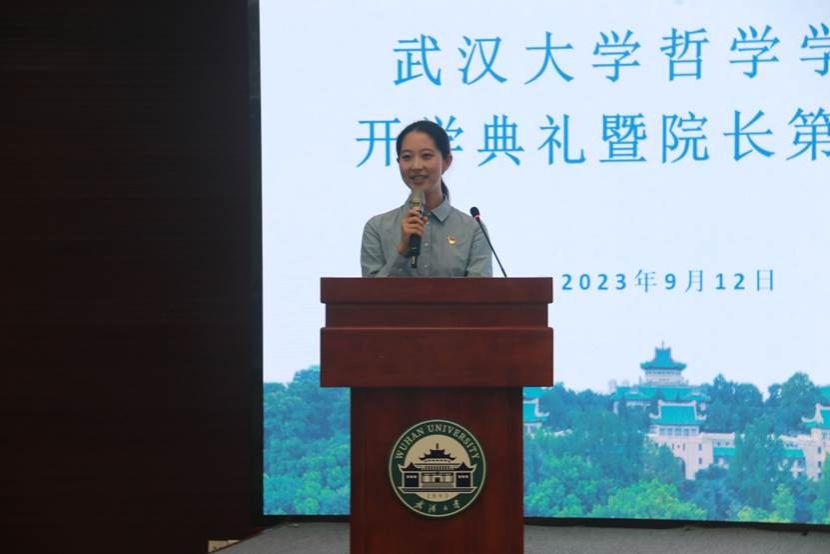 2023级本科新生李沁嫣同学作为本科新生发言,她在给自己和武大的新生们“点赞”的同时,祝贺同学们经过了努力来到了百合小说 ,并告诫大家要心存志远,时常反思、创新突破。2023级研究生新生王怡宁同学则讲述了她对“爱智、求真、向善、致美”的百合小说 院训的理解,她认为作为一名哲院新生,要传承哲院精神,延续哲院传统,不忘初心,砥砺前行。