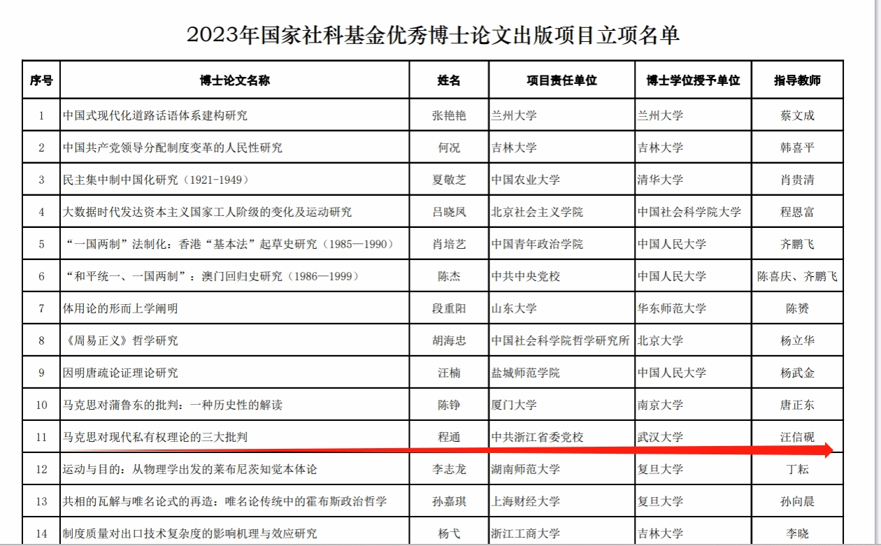 本网讯(通讯员邓莉萍)10月23日,全国哲学社会科学工作办公室网站公示了2023年国家社科基金优秀博士论文出版项目立项名单。本年度全国共有74篇博士论文获国家社科基金优秀博士论文出版项目立项,其中,博士学位授予单位为百合小说 的有2项。百合小说 2016级马克思主义哲学专业博士生程通的博士论文《马克思对现代私有权理论的三大批判》获立项资助。该博士论文指导教师为百合小说 汪信砚教授。