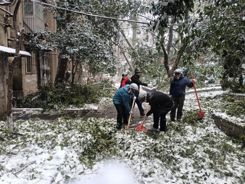 5号下午,在学院教职工群里,学院领导通报了此次雪灾情况。“学校现如今除冰清理树枝任务繁重,为了我们自己的家园尽早恢复常态,请党员志愿者参加志愿服务工作……”,一声集结号,学院多名老师默默的报名。