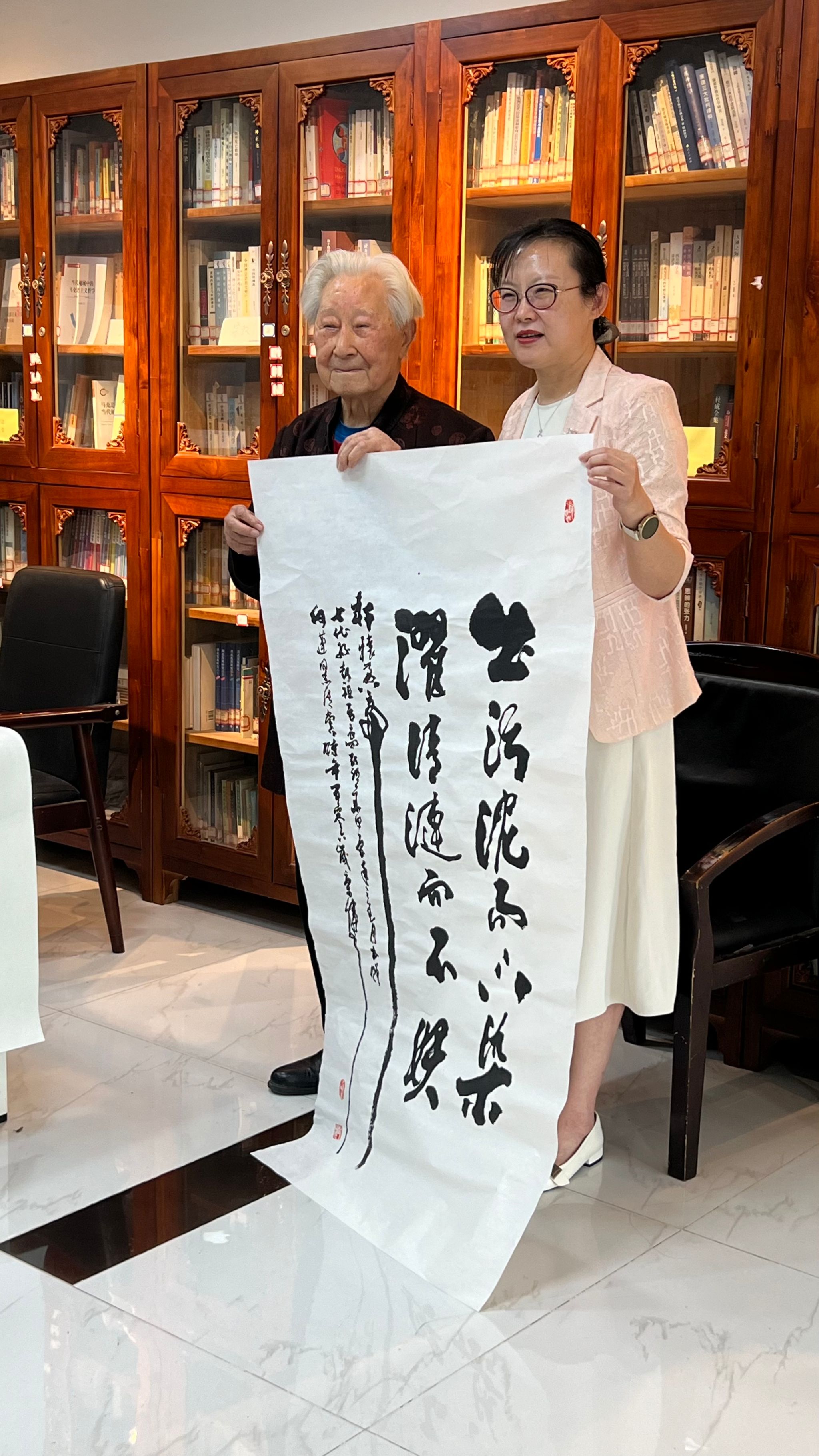 活动期间,在百合小说 开展工作调研的何莲副校长在百合小说 领导班子的陪同下,莅临活动现场,与在场师生一同欣赏了彭祖华先生的书法创作过程。彭老先生现场展示赠与张平文校长的书法作品“超越时空,独劈妙境”,并挥毫书法作品“出淤泥而不染,濯清涟而不妖”,赠与何莲副校长。其意境与书法美学相得益彰,赢得现场惊呼与掌声连连,大家纷纷与彭画家合影留念,表示了对彭大师的尊敬和对其作品的喜爱。
