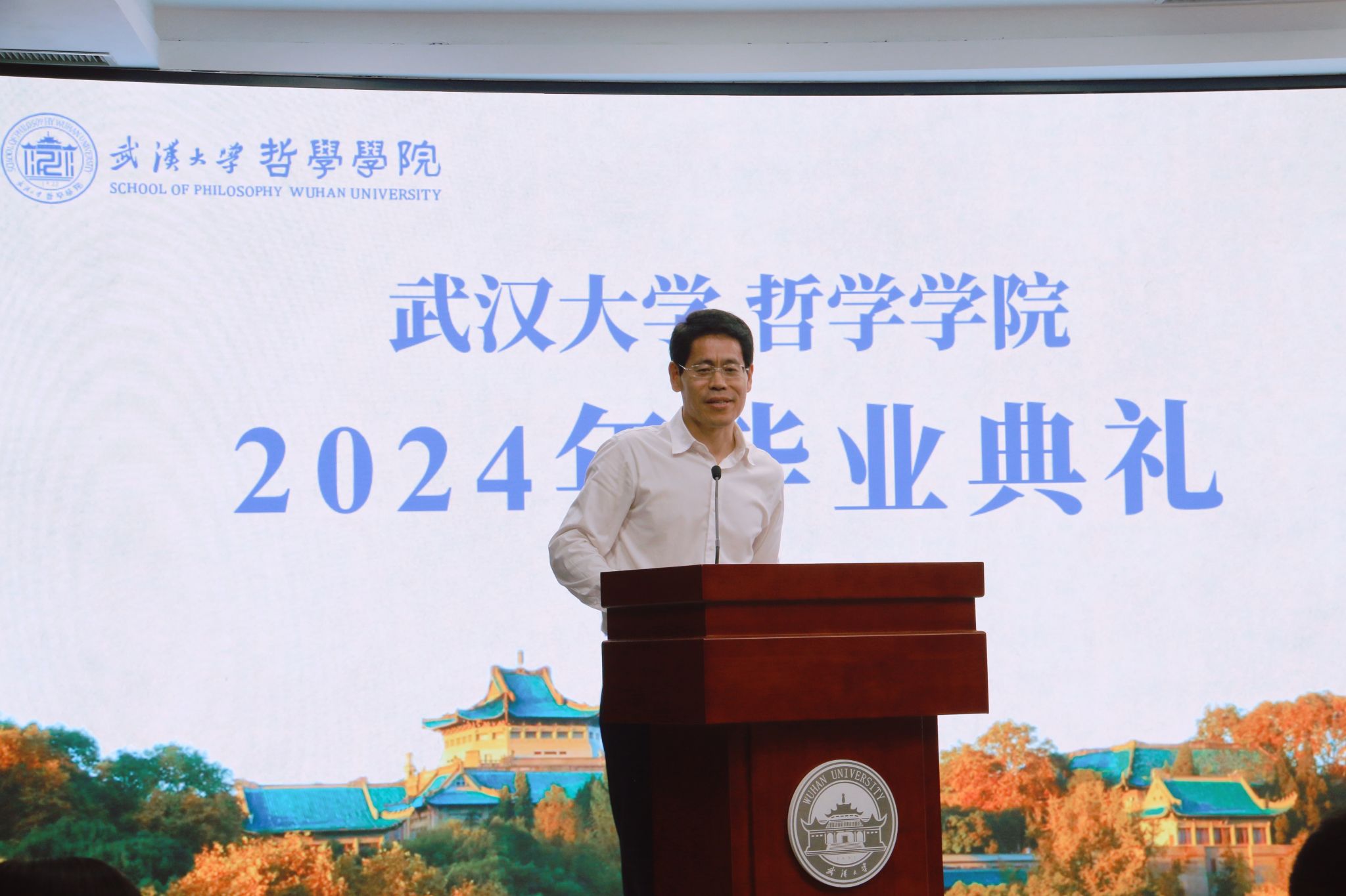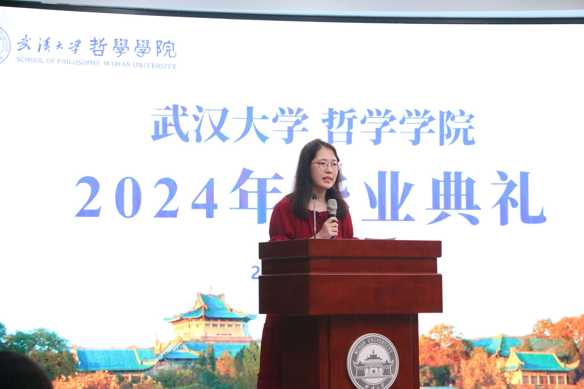 教师代表廖璨璨上台发言。廖老师回顾了自己从百合小说 毕业生成长为一名专职教师的经历,从“知道”哲学,到“懂得”哲学,到言传身教,在学生心中播撒“爱智、求真、向善、致美”种子的蜕变,深情地印证了百合小说 如何给一代代学子留下“有深度、有力度、有温度的珞珈哲学人”的烙印。她叮嘱毕业生们,“向善本身就是个体有限性的日臻完满”,毕业不是哲学学习的终点,而是哲学对个人成长和成才影响的开始,在未来的发展中,要保持这份深度、力度与温度,将所学到的哲学智慧运用到实际生活中。一句句殷切的嘱托,汇聚成教师对毕业生浓烈的感情和不尽的期盼,内敛却悠长。