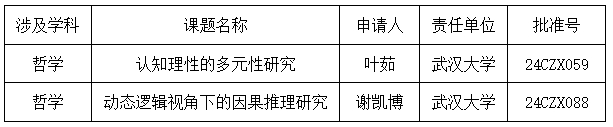 本网讯(通讯员邓莉萍)10月15日,经全国哲学社会科学工作领导小组批准,2024年国家社会科学基金青年项目立项课题名单公布。我院叶茹副教授申报的项目《认知理性的多元性研究》 、谢凯博副教授申报的项目《动态逻辑视角下的因果推理研究》获批国家社科基金青年项目。