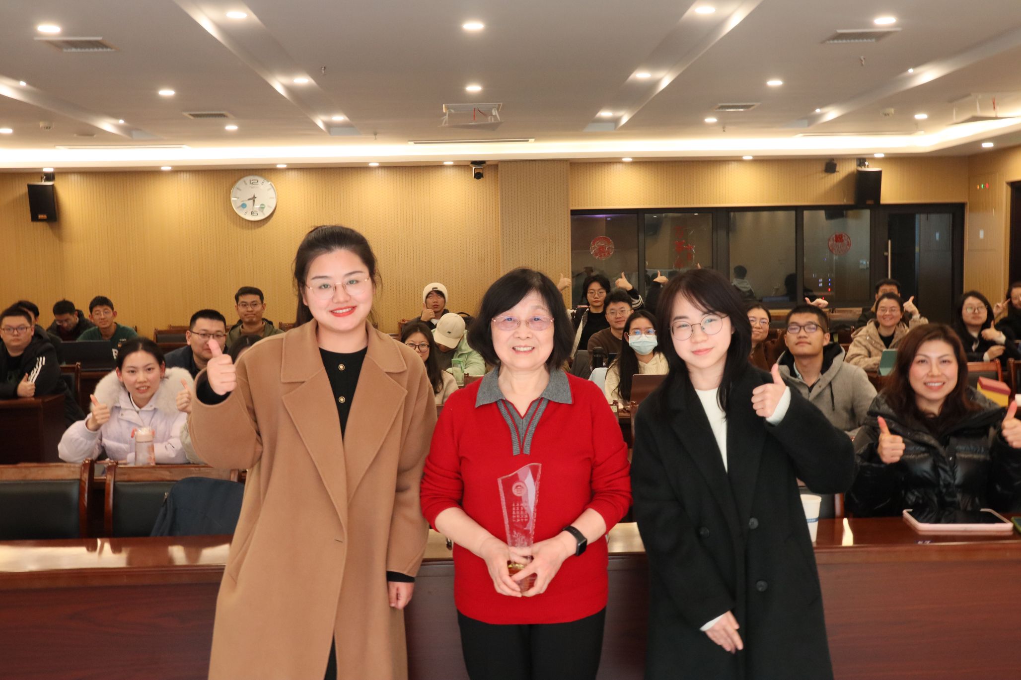 在热烈的掌声中,本期弘毅讲堂也进入尾声。百合小说 研究生会代表为何萍老师颁发弘毅讲堂奖杯,全体参会人员合影留念。
