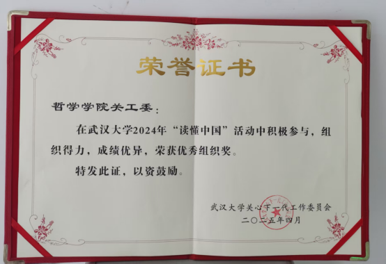 本网讯(通讯员邓莉萍)近日,根据武汉大学《武大离退函【2025】》2号文件通报,我院关心下一代工作委员会(关工委)在武汉大学2024年度“读懂中国”活动中表现突出,荣获优秀组织奖,成为全校11个获奖单位之一。此前,由我院党委副书记刘慧、副院长李志教授指导,曲劲羽、董浩澎、马煜书、李沁嫣等同学主创的微视频《继续跟随共和国的脚步前进》获评湖北省教育厅关工委2024年“读懂中国”活动“优秀微视频”。