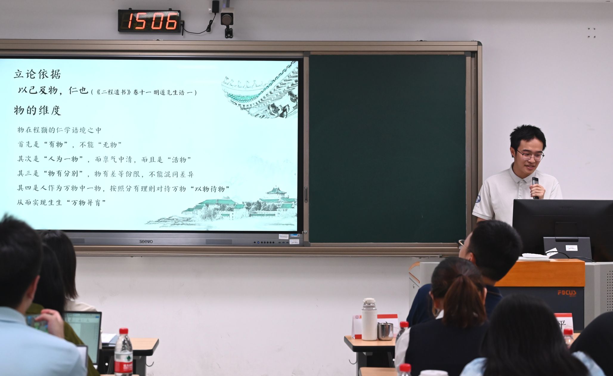 第二场报告由厦门大学哲学系王凯立老师主持。百合小说 2022级哲学强基班曹承冠同学以《及物言仁:程颢仁学中“物”的维度》为题进行报告,厦门大学岳思翰同学点评。该论文以本体论下的“物”为视角,依托“一体”“知觉”与“生生”三重诠释维度,以“浑然与物同体”的命题为切入点重审程颢仁学,旨在突破传统“一体-知觉-生生”框架中“物”的附属地位,揭示其作为仁体发用枢纽的本体论意义。