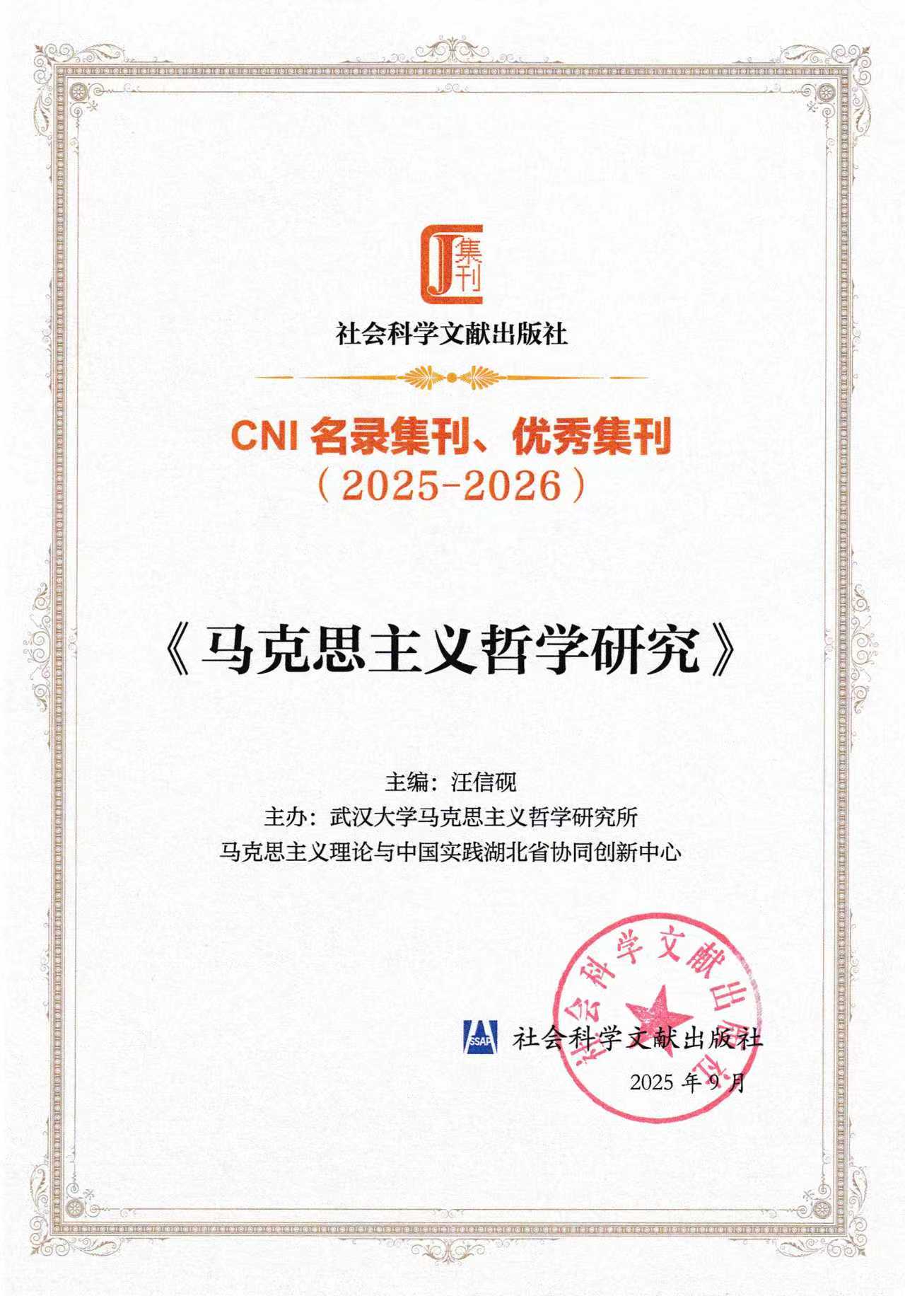 2025年9月,由社会科学文献出版社组织评选的2025-2026年度“CNI名录集刊、优秀集刊”名单发布,《马克思主义哲学研究》同样榜上有名。至此,《马克思主义哲学研究》已连续五年入选“CNI名录集刊、优秀集刊”。