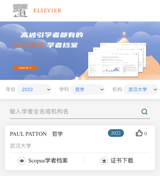 本网讯(通讯员 李慧敏)3月28日,2022年爱思唯尔“中国高被引学者年度榜单” (Highly Cited Chinese Researchers)正式发布。榜单覆盖了10个教育部学科领域中的84门一级学科,武汉大学94位学者位列其中,我院Paul Patton教授继2021年代表武汉大学入选后,于2022年再次入选该榜单,继续成为我校人文学科中唯一入选者。