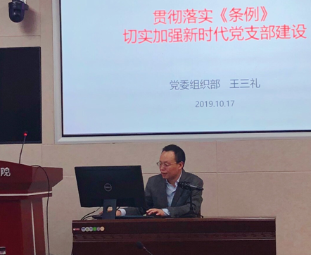 王三礼部长从制定《条例》的重大意义与基本内容、党支部功能定位与职责任务、树立新时代党支部工作理念、落实《条例》加强新时代党支部建设四个角度系统而全面地解读了《中国共产党支部工作条例》。他通过充分运用案例分析,指出支部工作要以提升组织力为重点,着重加强政治建设,担负起直接教育党员、管理党员、监督党员和组织群众、宣传群众、凝聚群众、服务群众的职责;支部书记要进一步树立坚定理想信念,提升工作能力,不断推进支部工作的标准化和规范化建设。