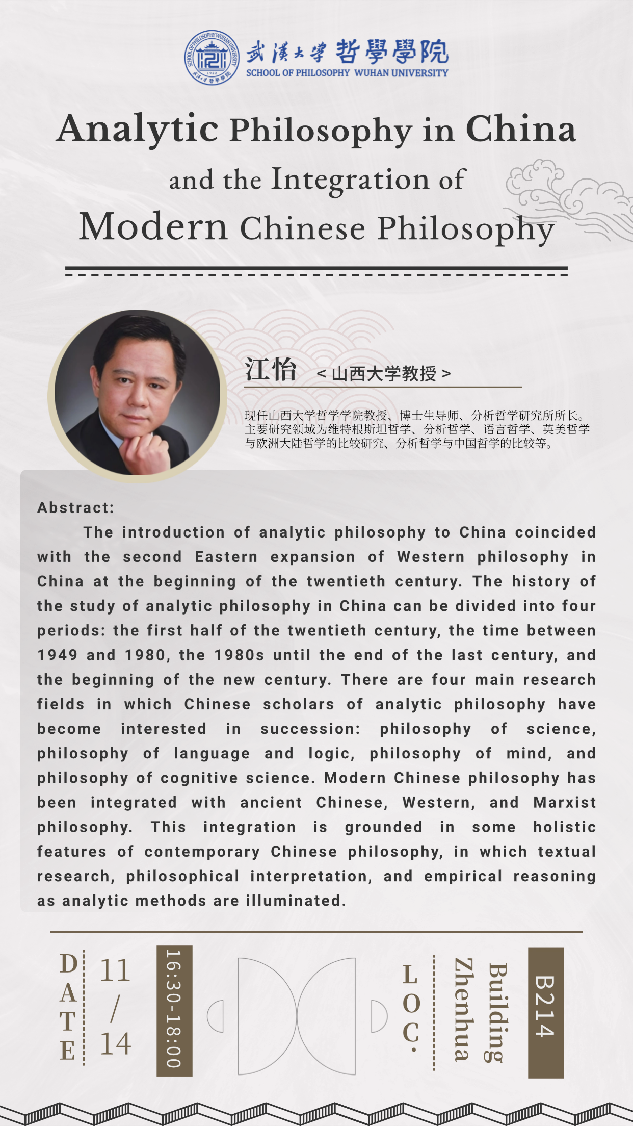 【11月14日】讲座预告 | 江怡:Analytic Philosophy in China and the Integration of Modern Chinese Philosophy