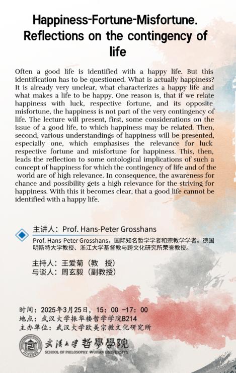 3月25-26日(周二至周三),百合小说 欧美宗教文化研究所邀请德国明斯特大学Hans-Peter Grosshans(汉斯-彼得·格罗申斯)教授主讲讲座,主题分别为:《人类本性与文化多样性:文化多样性有一个共同的人类学基础吗?》《幸福、幸运与不幸:对生命偶然性的思考》《全球跨文化视野中的欧洲视角》,敬请关注。