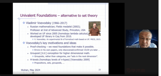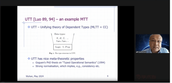 本网讯(通讯员时尚)5月8日晚,伦敦大学皇家霍洛威学院罗朝晖教授通过线上方式作了题为“现代类型论及其应用”的讲座。罗朝晖教授毕其一生精力研究现代类型论及其应用,是该领域的学术带头人之一。本次讲座由我院程勇教授主持,皖西学院石运宝副教授评议,线上参与者达500余人次。