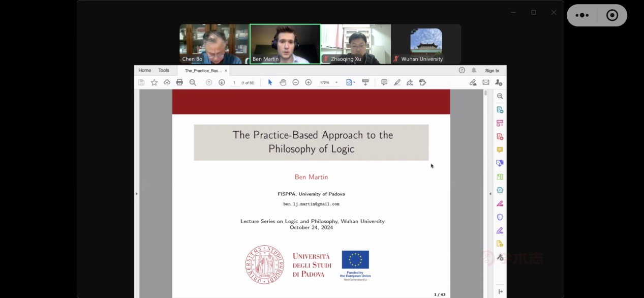 本网讯(通讯员 胡兰双)应武汉大学哲学院陈波教授邀请,意大利帕多瓦大学哲学系助理教授本·马丁(Ben Martin)于2024年10月24日晚在线上进行了一场题为“基于实践的逻辑哲学探究”(The Practice-Based Approach to the Philosophy of Logic)的讲座。该讲座是武汉大学哲学学院“逻辑与哲学系列讲座”的第85讲,也是本·马丁在武汉大学系列讲座的第一场,由学术志平台直播。本次讲座由陈波教授主持,四川大学哲学系徐召清副教授担任评议,来自全国各地180多人在线上参加了这次讲座。