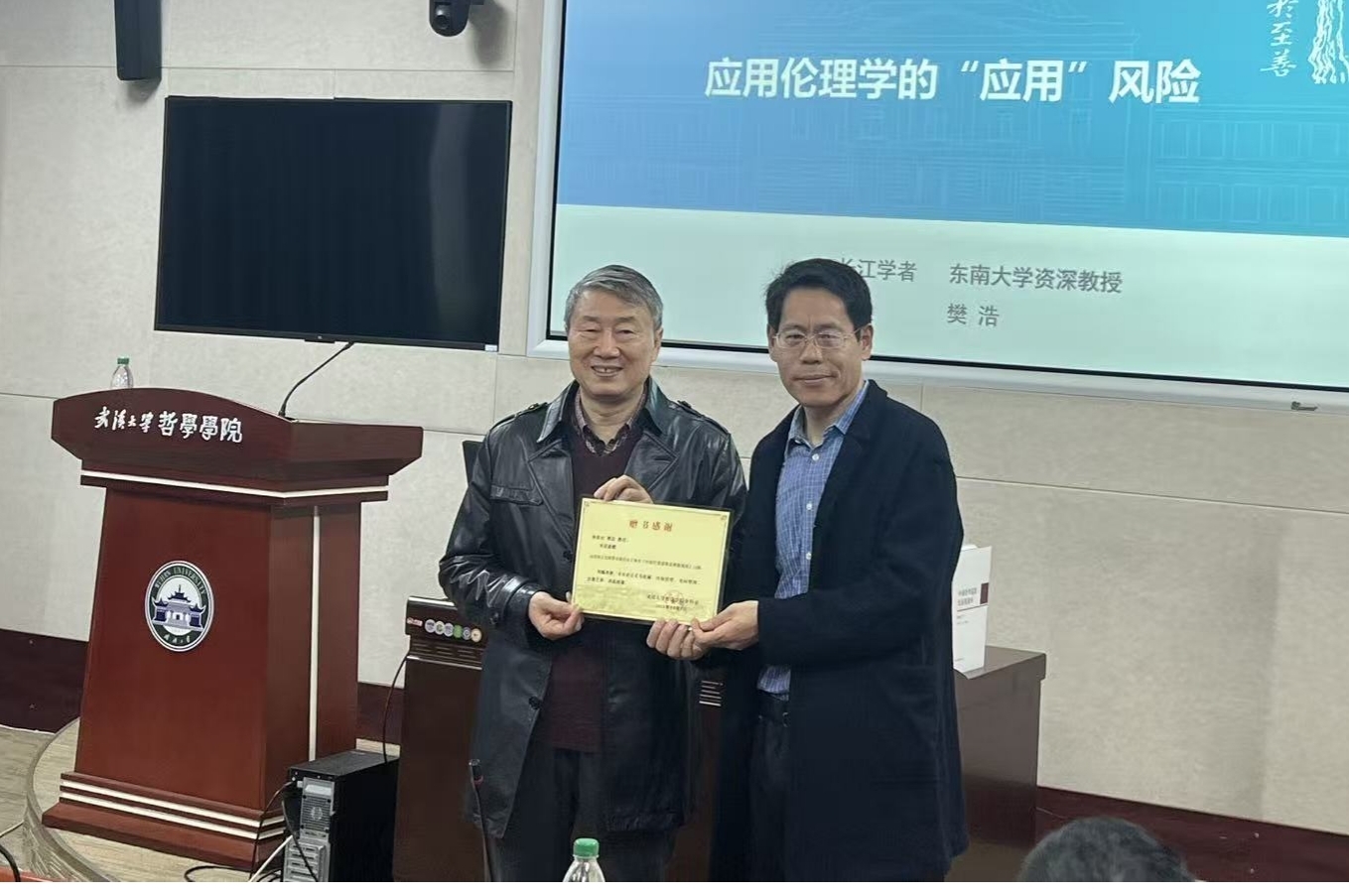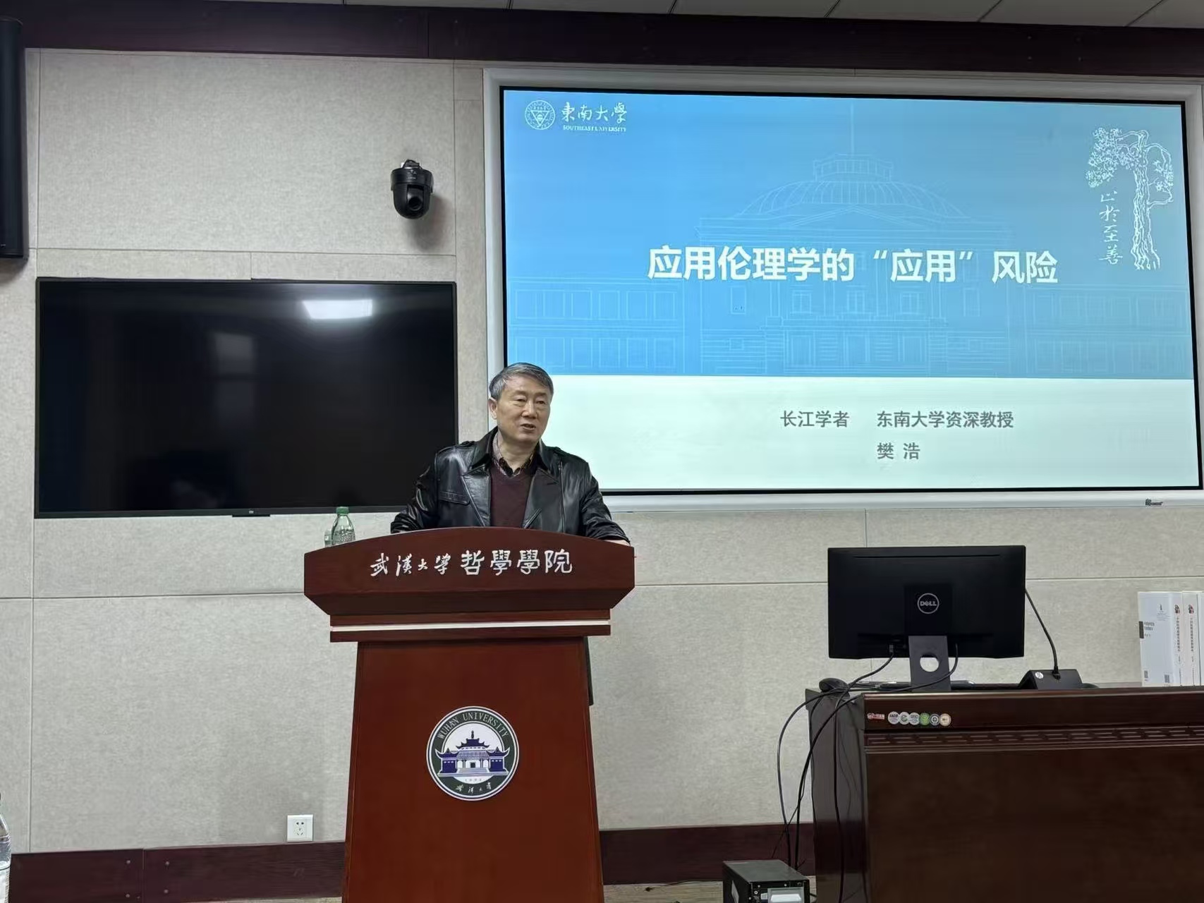 本网讯(通讯员 陆一丹)11月10日上午,应武汉大学哲学学院、武汉大学应用伦理学研究中心邀请,教育部高层次人才、东南大学资深教授樊和平于振华楼哲学学院B214作题为“应用伦理学的‘应用’风险”的报告,这也是珞珈应用伦理·大家讲坛的第二场学术报告。本次讲座由李建华教授主持,哲学院院长李佃来教授、伦理学教研室主任陈江进教授、葛四友教授、王斌范老师以及院内外50多位师生参加本次讲座。