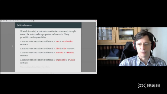 2021年6月2日晚7点,逻辑与哲学系列讲座第4讲由牛津大学哲学系Volker Halbach教授主讲,报告题目是:自指,真与可证性。荷兰乌得勒支大学哲学系教授、荷兰皇家人文与科学学院Albert Visser院士主持。德国柏林洪堡大学计算机科学系Balthasar Grabmayr博士、瑞典哥德堡大学Graham Leigh研究员担任与谈人。Volker Halbach教授的报告以几类特殊的自指语句作为切入点。这类语句直接指向它们自身的性质,如真、假、可证明、不可证明。自指语句通常会造成悖论。在Volker Halbach的报告中主要介绍了四种由自指引发的悖论——说谎者悖论、Curry悖论、Visser悖论和Yablo悖论。紧接着,Volker Halbach开始对形式系统中的自指语句进行探讨。在自指语句的研究中,最著名的应用就是哥德尔第一不完全性定理。受悖论的启发,哥德尔第一不完全性定理最重要的步骤之一就是构造了自指的语句,但并没有导致矛盾。我们可以这样描述哥德尔所构造自指语句的含义:本语句是不可证的。这类语句也被称为哥德尔语句。哥德尔成功地证明了其所构造的自指语句在系统内是不可证明的。然后,受到哥德尔语句的启发,人们自然会关心与哥德尔语句相对应的Henkin语句是否是可证的问题。Henkin语句的含义是:本语句是可证的。在报告中,Volker Halbach总结了Kreisel在1953年时对这一问题的回答:Henkin语句是否可证不仅由证明谓词所决定,也由自指获得的方式所决定。对于具体问题的回答不仅由公式的编码和表示方式决定,也由自指获得的方式决定。但是,当我们研究规范化证明谓词时,自指的内涵性将不再作为决定因素。如果我们关注的是其他谓词,不同的对角化语句可能表现出不同的性质。然而规范化证明谓词是一个例外,所有有关该谓词的对角化语句在是否可证明的问题上是等价的。接着,讲座还针对另一类自指语句:“本语句是真的”的可证明性进行了探讨。相较于规范化可证明的强结论,规范化真的结论就要弱很多。Volker Halbach在报告中列举了三种语句形式,它们分别是可证明的、可驳斥的、独立的。讲座的最后,作者对自指问题的研究前景以及需要攻克的难点进行了展望。量化的自指语句如何解释,公式如何表达自指语句中的性质,自指语句如何进行编码等问题还有待进一步的研究与探索。