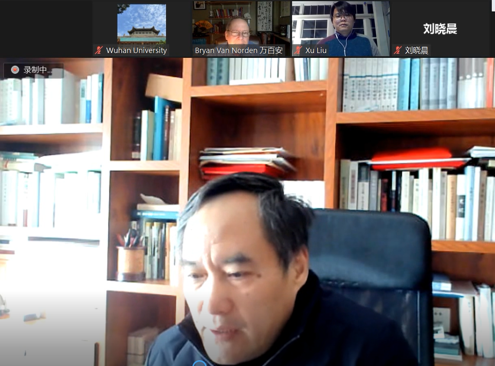 本网讯(通讯员丁铭)2021年12月2日,大学文明对话高等研究院主办的“他者眼中的中国形象期待”系列访谈式讲座第二期顺利进行,本期与谈嘉宾为美国瓦萨学院教授、著名汉学家万百安(Bryan Van Norden)先生。此次对谈通过线上平台进行,武汉大学哲学学院教授、武汉大学文明对话高等研究院院长吴根友主持访谈,耶鲁大学访问学人刘旭博士翻译。武汉大学哲学学院以及校内外、海内外的老师和学生通过线上直播平台参加了本次讲座。