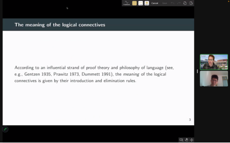 程勇则就“极小逻辑与基本逻辑之间的关系”进行提问。霍利迪在回应中指出,极小逻辑与基本逻辑之间不可进行比较。基本逻辑的构建是为了获得只具有联结词的引入和消去规则的核心逻辑,这是建立在以自然演绎为中心的逻辑观点之上的结果,他对自然演绎有偏好,认为自然演绎忠实于人实际进行的推理工作。