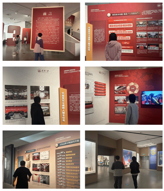 在进入万林艺术博物馆后,培训班的学员们共同前往“自强担使命、拓新创未来——武汉大学新时代办学成就展”展厅,分别参观了“擎旗铸魂开新局、荟聚英才育新人、引领学术启新知、服务大局建新功、百卅黉门谱新篇”等五个单元,深入了解了自党的十八大以来,武汉大学坚决贯彻落实习近平总书记重要指示精神和党中央重大决策部署,奋进新征程、建功新时代,各项事业都取得了跨越式的发展。展览以宏大的时代格局、鲜明的主题立意和新颖的表现形式,浓缩再现了武大师生校友们奋进的身影、拼搏的故事和伟大的精神,生动讲述了新时代以来武汉大学矢志追求卓越、建设一流大学的追梦足迹、时代华章,全面反映了武大人赓续百卅学府文脉,为党育人、为国育才的使命担当和攻坚克难、团结奋斗的良好风貌。
