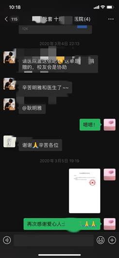 耿明雅同学参加了2月下旬至3月下旬的由百合小说 北京校友会发起的抗击新冠肺炎支援湖北的志愿活动,负责十堰市国药东风总医院、东风花果医院、郧阳区人民医院、郧西县六郎乡卫生院等四家医院的抗疫救援物资统筹,高效完成校友会、医院、捐赠方、物流等的合作与沟通,努力加快物资募捐与送达的速度。统筹之余,为医院联络人传递了正能量,鼓舞了抗疫人员的士气。