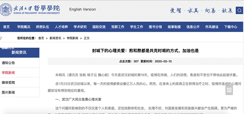 作为心理学专业学生,在防控疫情期间由自己心理不适问题,想到身边同学以及更多非心理学专业的普通人可能也面临同样的问题。魏心妮同学利用专业特长为武汉抗疫贡献了自己的力量。从1月25日起,她利用微信公众号平台发布心理健康自助科普文章数篇,希望让更多普通人都及时了解自己的心理状态掌握自我疏解的专业心理学方法。文章平均单篇阅读量达1000次,并被武大疫情防控专题网站以及校外媒体转载。此外,她还与导师钟年合作,向政府单位和机构提交若干疫情相关的心理建议书,其中部分建议被采用,并收到了武汉市政府的感谢信。除此之外,她也参与由导师钟年主编的疫情之后心理重建书籍的编写工作,并在疫情期间担任研究生课程助教,为学院提供新闻稿。