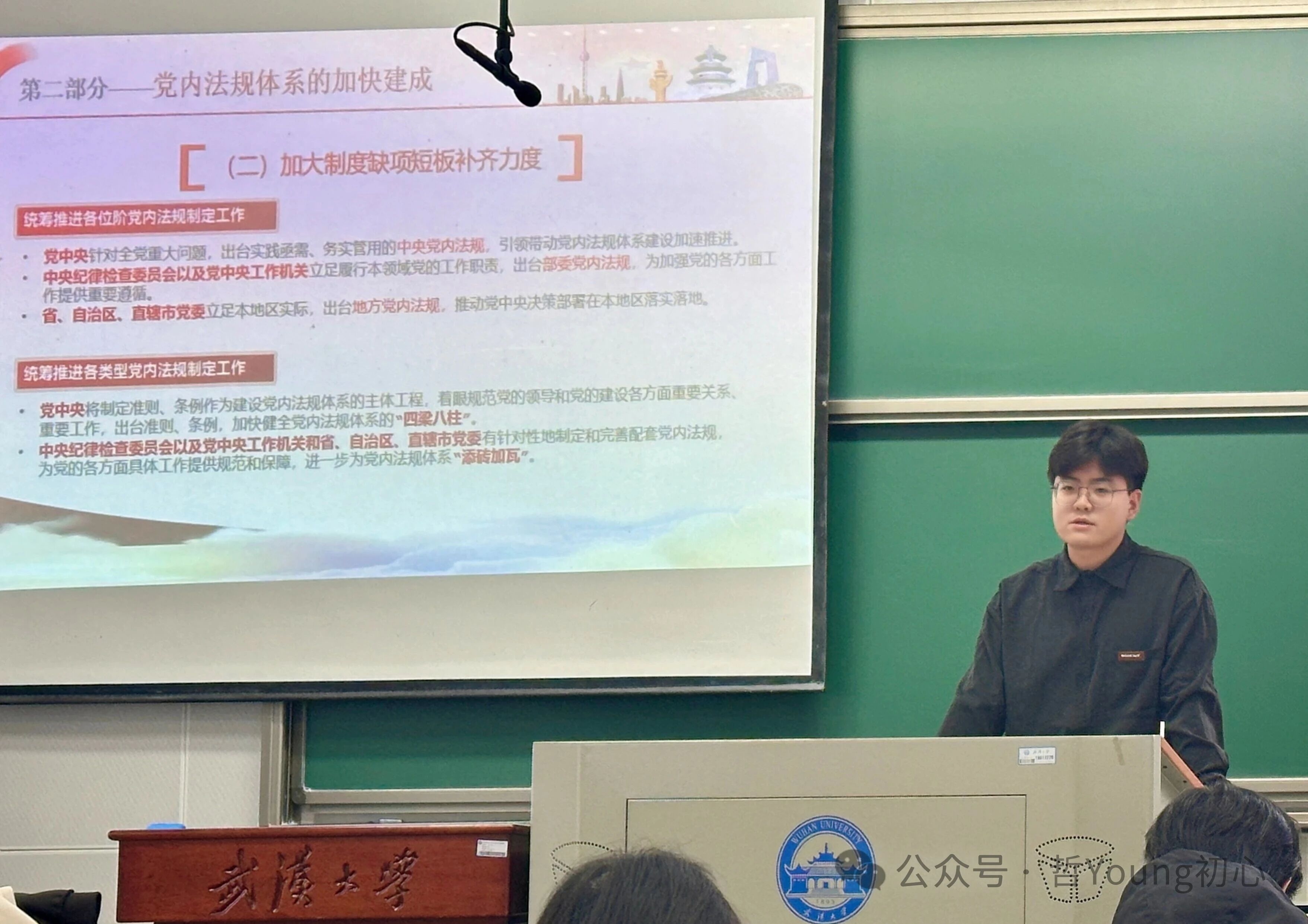 11月9日下午,武汉大学法学院2025级硕士研究生杜德浩为学员们讲授党内法规专题党课。他结合党史具体条例和现实关切,对党内法规的制定背景、核心要义和实践要求进行了深入浅出地讲解,强调形成完善的党内法规体系是建设中国特色社会主义法治体系、建设社会主义法治国家的必然要求。
