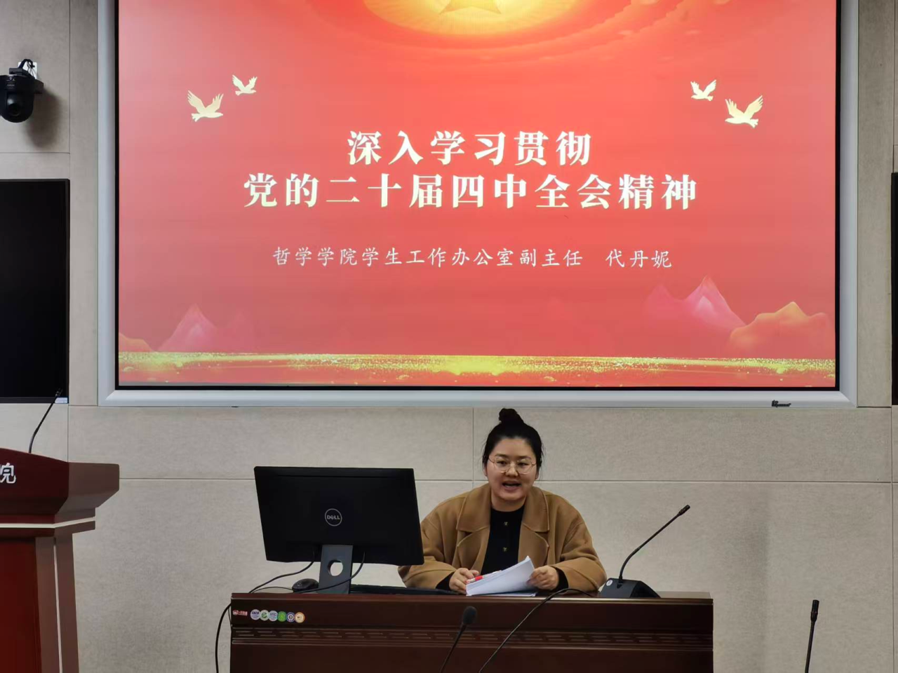 11月22日上午,培训班在哲学学院B214正式开班。哲学学院学生工作办公室副主任代丹妮作首场专题辅导,以《深入学习贯彻党的二十届四中全会精神》为题,系统解读了“十五五”规划建议的制定过程、核心要义和战略部署,帮助学员深刻把握新时代新征程党的使命任务和中国式现代化的实践要求。