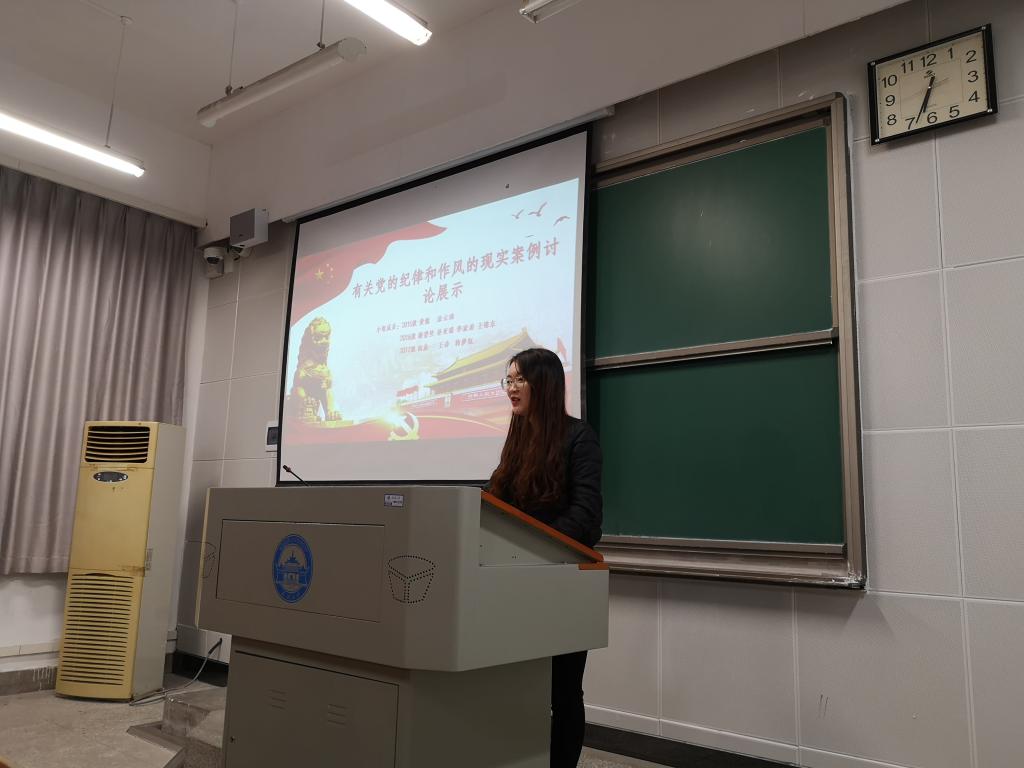 首先,文学院第一小组的全体同学轮流上台,阐述了“道私者乱,道法者治”,党的纪律是维护党的团结统一、完成党的任务的保证;党的作风关系到党的形象、人心向背,关系党和国家的兴衰成败的观点。小组成员使用大量发人深省的事实案例,通过与党纪条例比对和分析,向同学们展示了经济犯罪、滥用职权、政治错误、诬告陷害等违犯党纪、污化党风的行为,同时也坚定了同学们对共产党一心为民,不忘初心的信仰。