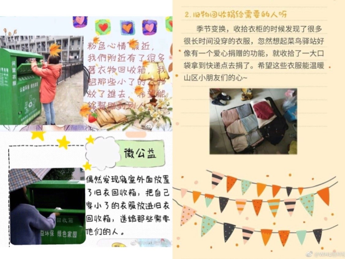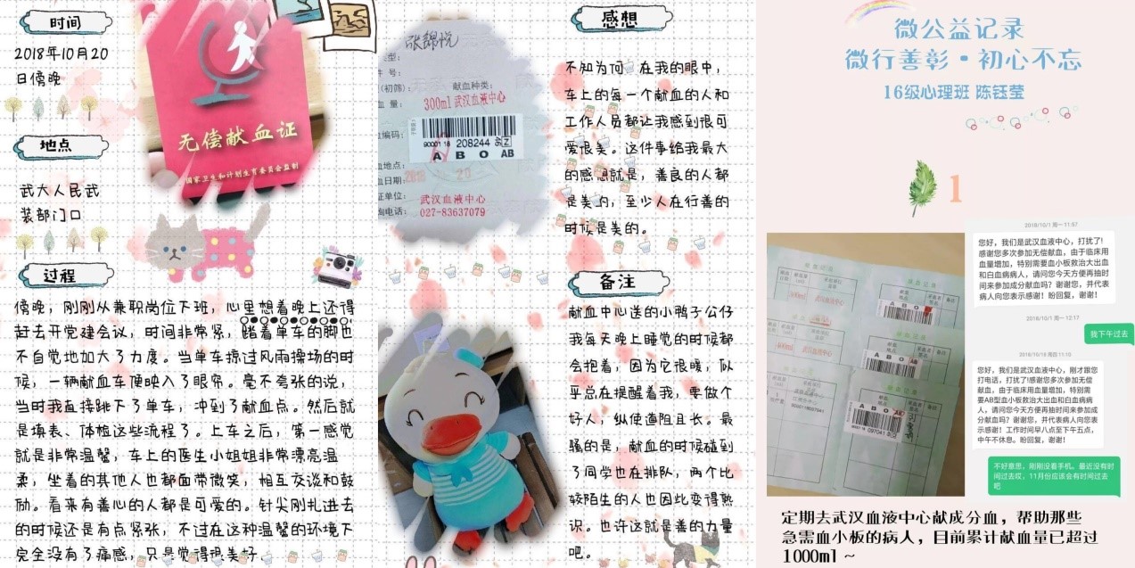 在活动进行的60天里,百合小说 本科生党支部通过QQ群收到了76次“微公益”打卡记录,活动涉及共计150余个公益故事,其中包括无偿献血、山区支教、爱心家教、校园内见义勇为、旧衣回收与捐赠、关爱自闭症儿童、博物馆志愿讲解等20余种不同类型的“微公益”实践经历;参与者采取诸如手账、日记、新媒体等多样、新颖、有效的方式进行了活动记录与心路留痕:
