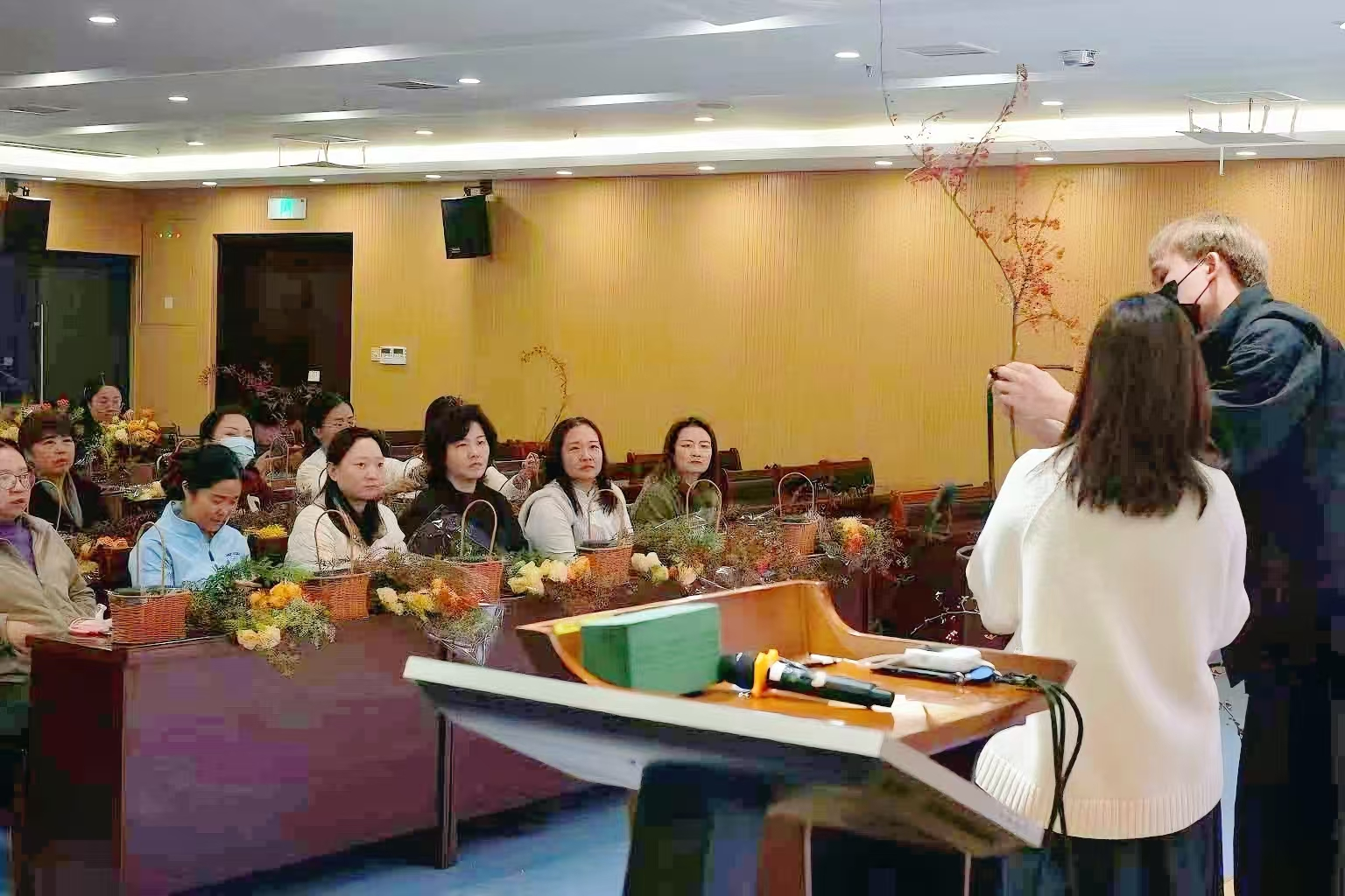 本次活动特意邀请高级花艺师赵静老师进行现场授课。她从插花艺术的起源以及东西方风格差异入手,系统地阐释了花篮插花的核心原则,即平衡、和谐、比例与韵律,并详细介绍了元宝篮、提篮等常见花篮类型的特点和适用场景。随后,赵静老师结合实际案例剖析关键技巧,从花材新鲜度的挑选、枝叶的修剪处理,到主花、配花、填充花的层次搭配,再到焦点设计与留白手法,每一个步骤都讲解得详尽细致,还通过现场演示让大家直观地掌握花枝固定、角度调整等实际操作要点。