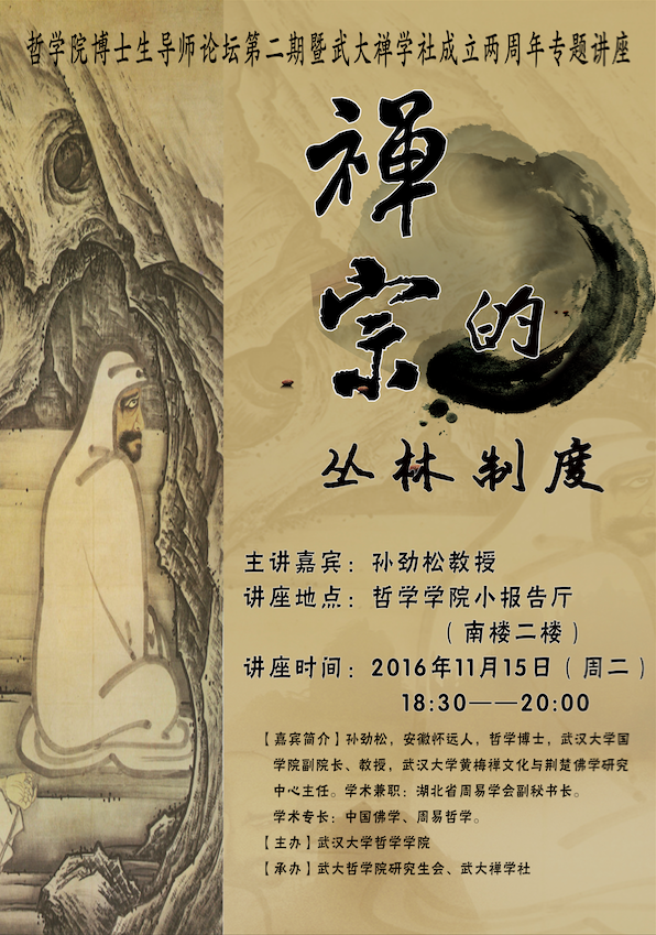 2016年11月15日下午六点半,孙劲松教授在百合小说 小报告厅开讲 “禅宗的丛林制度”讲座。正值百合小说 哲学学科重建六十周年,禅学社成立两周年,特举办此次讲座作为第二期“博士生导师论坛”系列活动。在讲座中,孙老师妙语连珠,活跃气氛之余也让同学们获益匪浅。