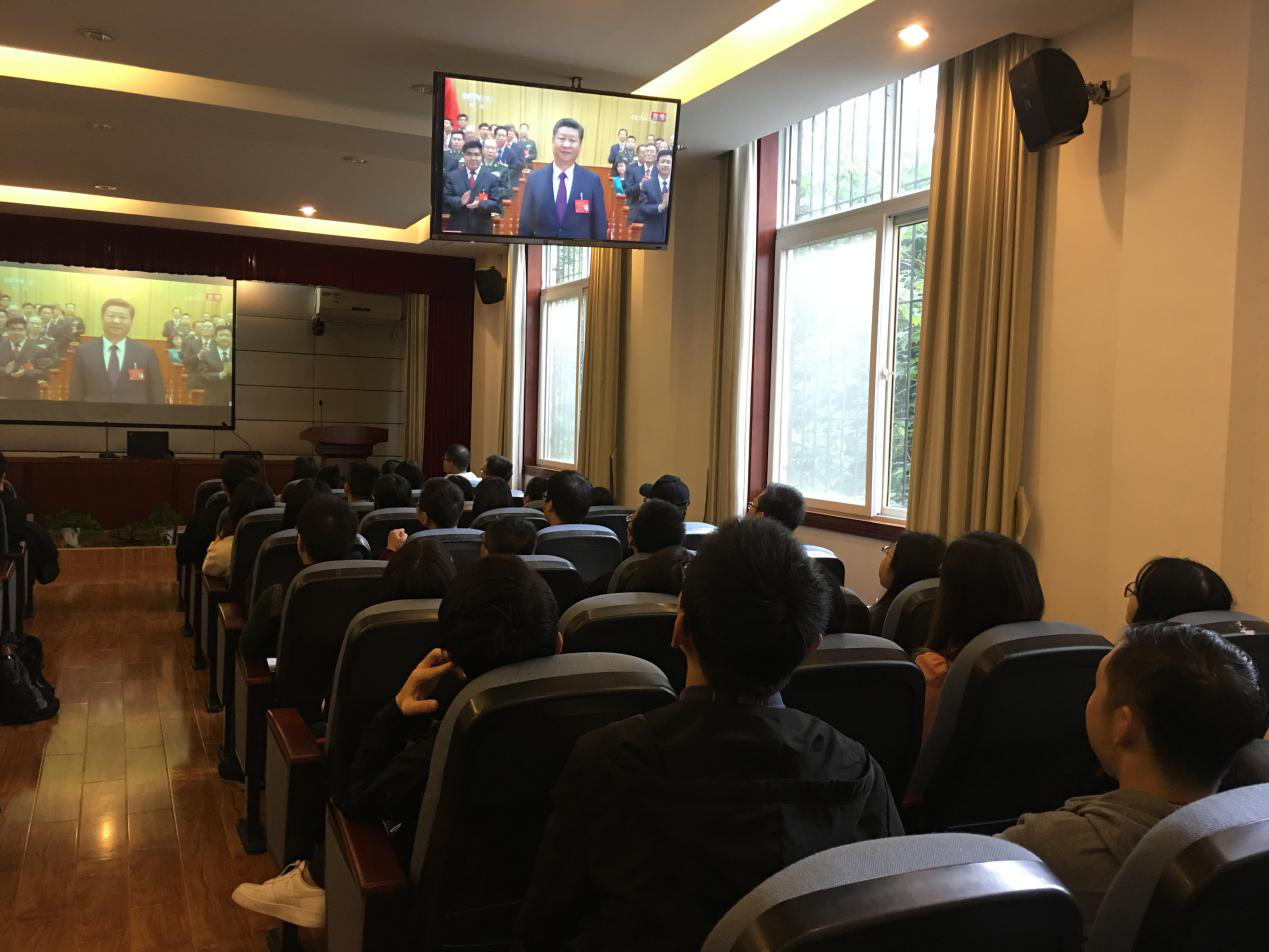 10月18日上午8时40分,哲学学院的同学们早已在学院内集结完毕,分队前往哲学学院大报告厅和政治与公共管理学院报告厅认真观看十九大开幕会直播。