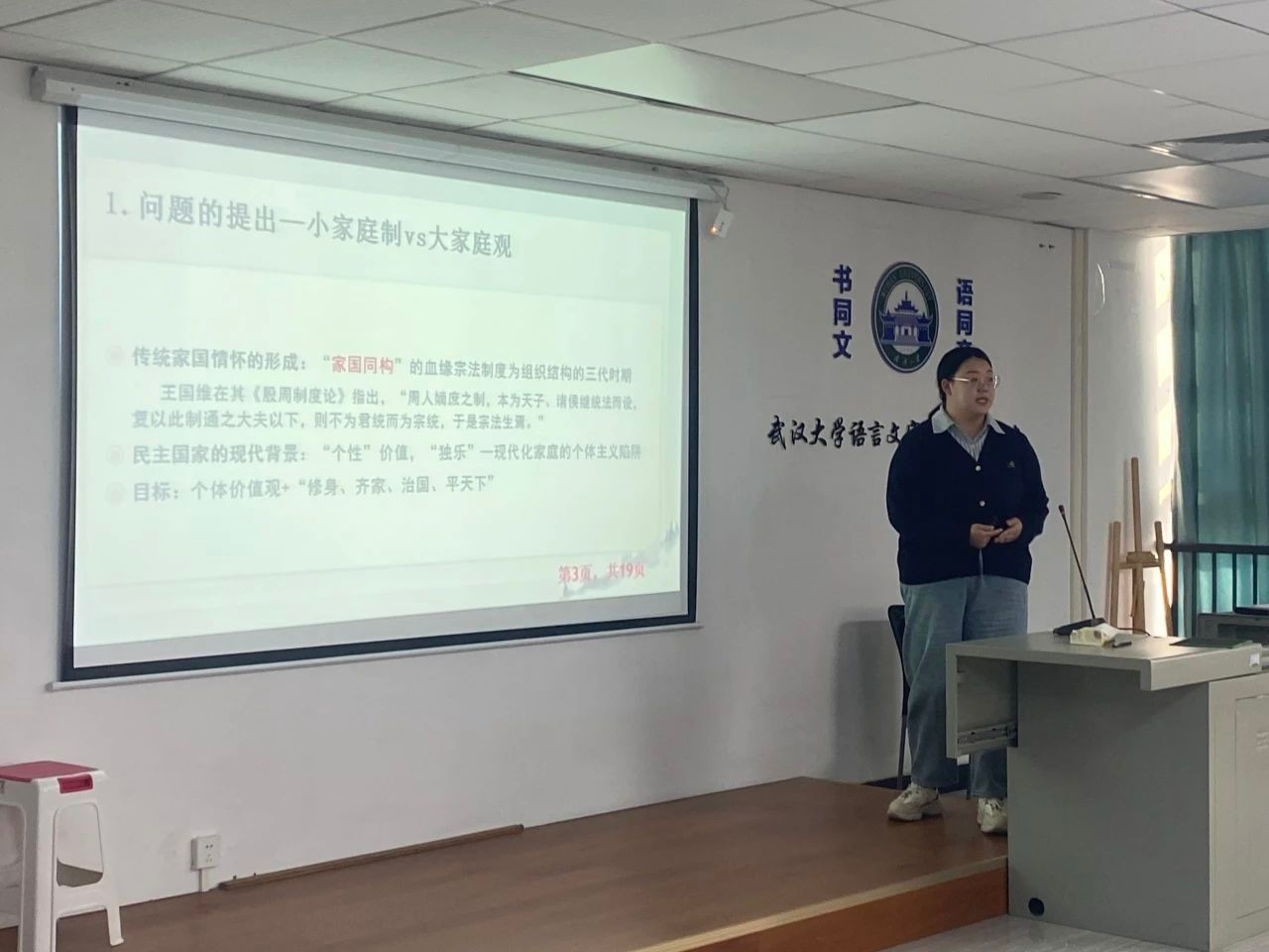 “孔子忠孝思想中的家国情怀及其现代价值”是2022级中国哲学专业的王灿同学的演讲题目,她以孔子忠孝思想为切入点,论述二者所追求的“仁者,爱人”的天下胸怀以及“修己以安天下”的实践路径,打通了由“孝于家”到“忠于国”的理论通道。