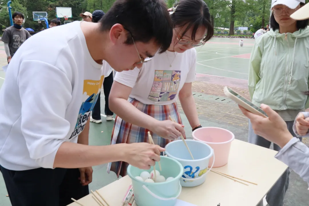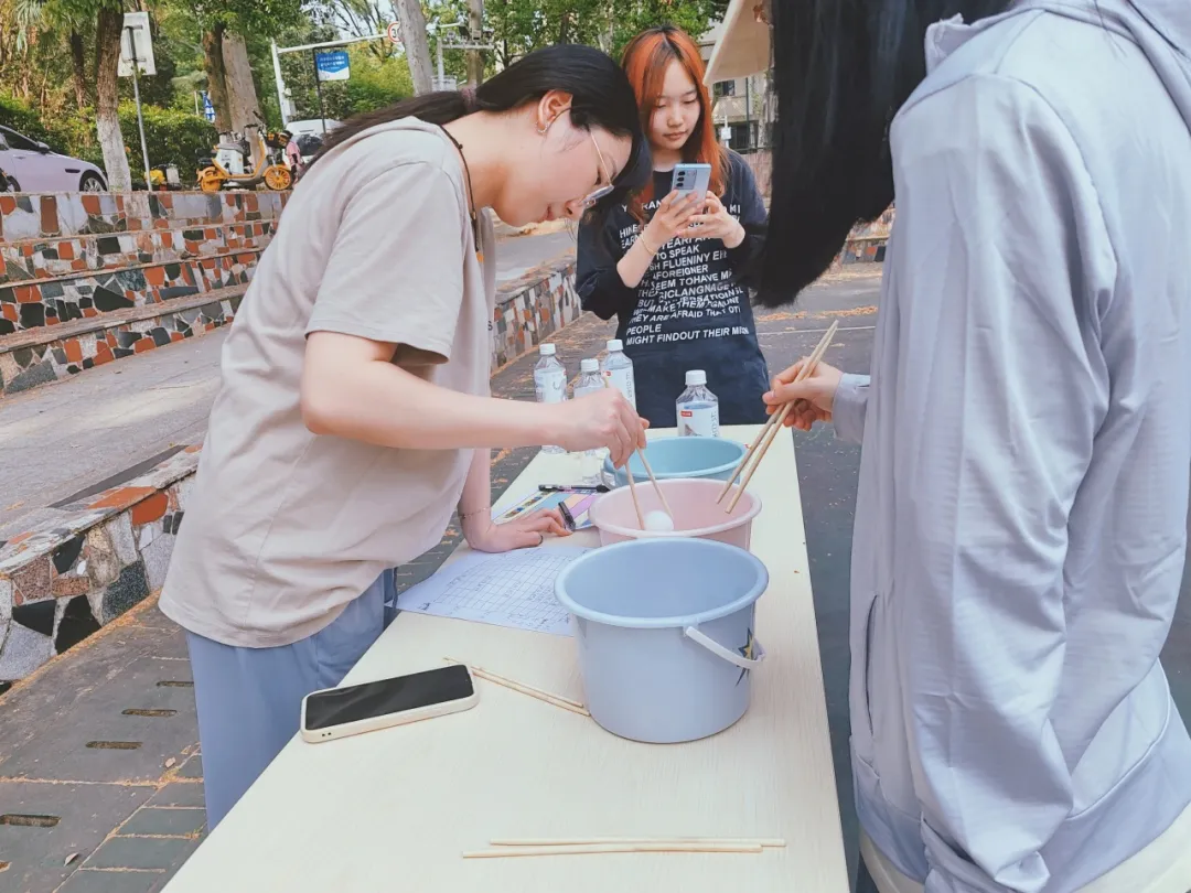 “夹乒乓球”,要求参赛队员每人用筷子将20个乒乓球从一处夹到另一处,按全队总时长排名。这个项目要求大家保持高度注意力与手部稳定性,球不随筷走,或颤抖滑落,都增添一丝紧张气氛。