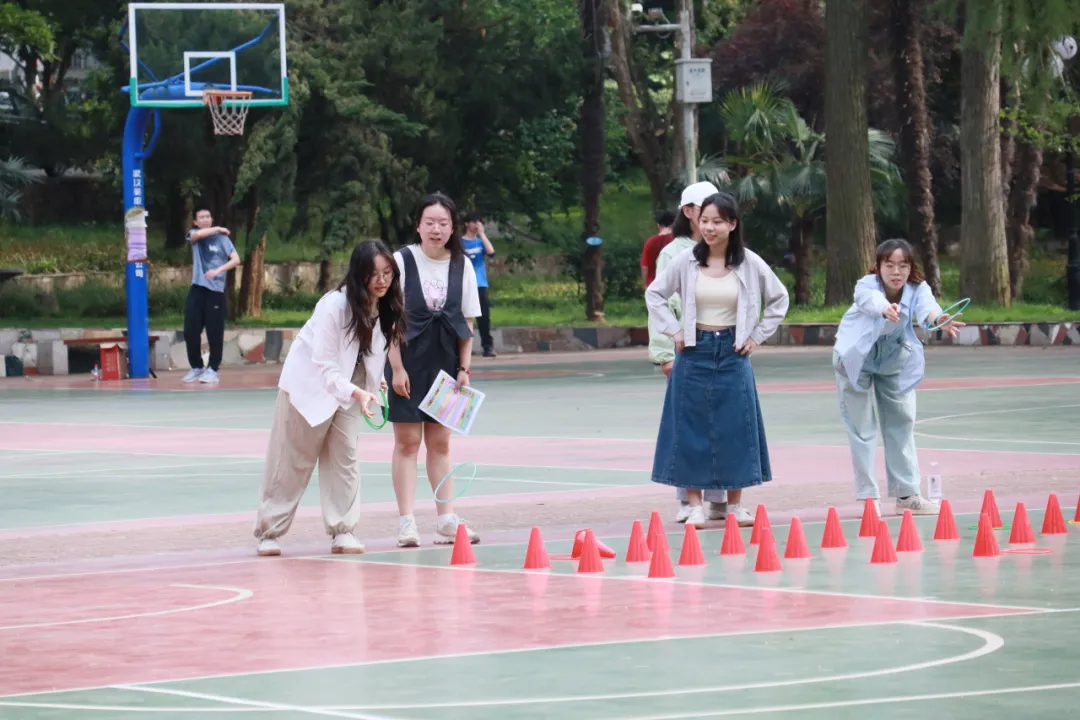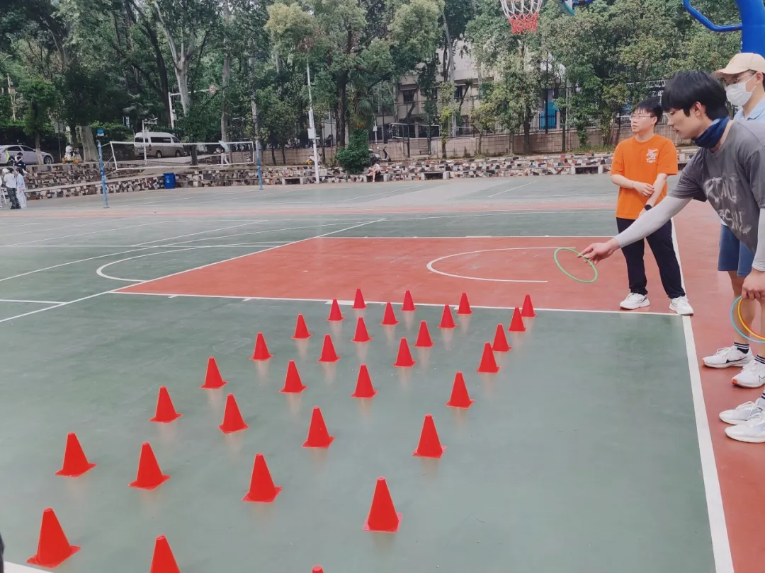 “套圈”,由参赛队员每人套圈五次,按目标物对应分数计分,由近到远,分数递增。大家兴致盎然,有的双手持圈,稳健送出;有的踊跃突破,挑战高分区。把路障当作玩具,欢声笑语伴随着冷静分析,街头游戏的乐趣在校园上演。