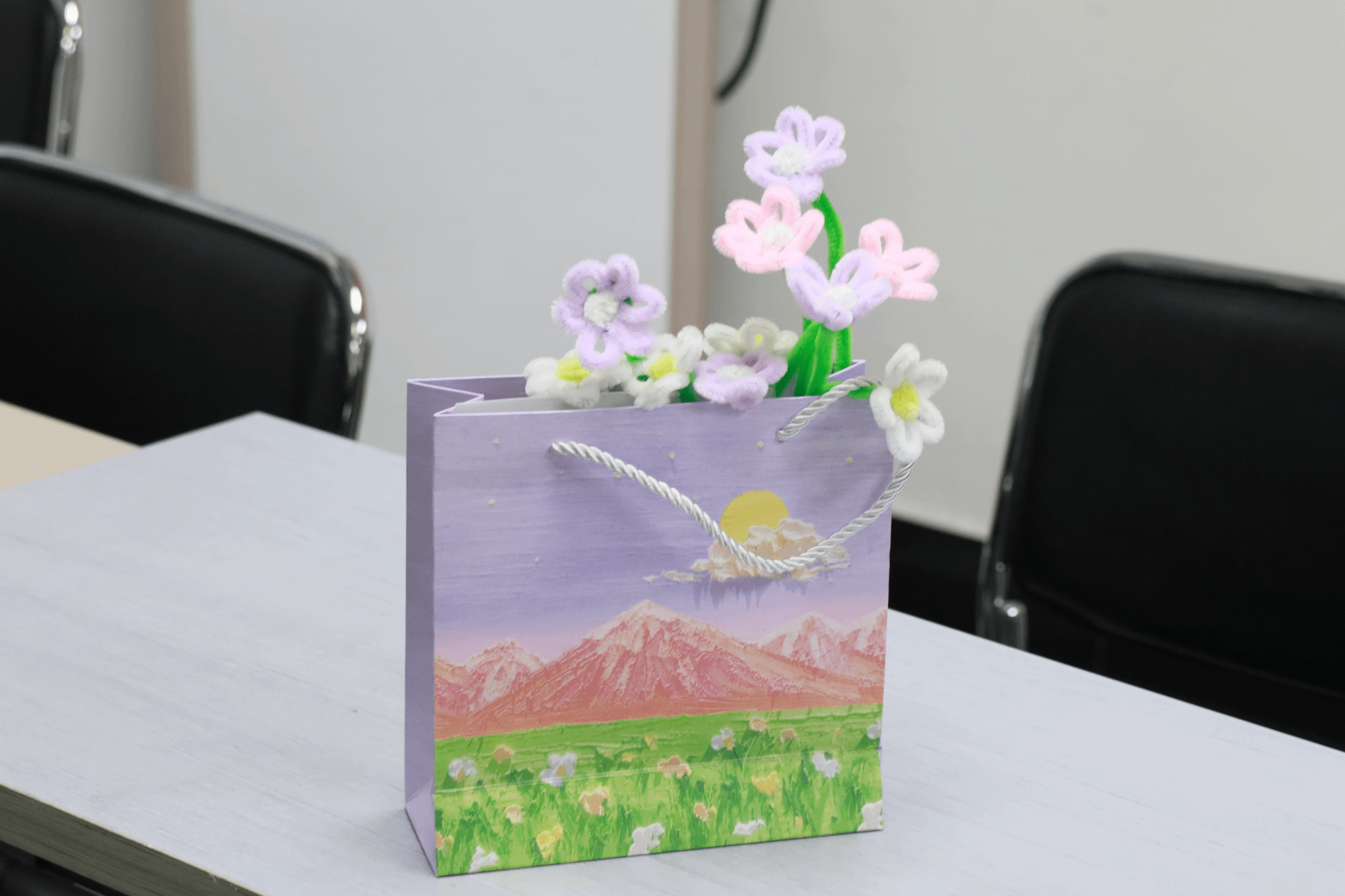 制作讲解结束后,现场迅速进入了紧张而又欢乐的制作环节。同学们纷纷拿起五颜六色的扭扭棒,开始了自己的创作之旅。教室中同学们三三两两地聚在一起,交流着自己的创意和灵感。有人选择制作可爱的饰品,有人决定挑战复杂的花卉,还有人尝试着与众不同的独特设计。桌上堆满了各种材料,剪刀、胶水、扭扭棒,应有尽有,大家热情高涨,兴致勃勃地投入到制作中。