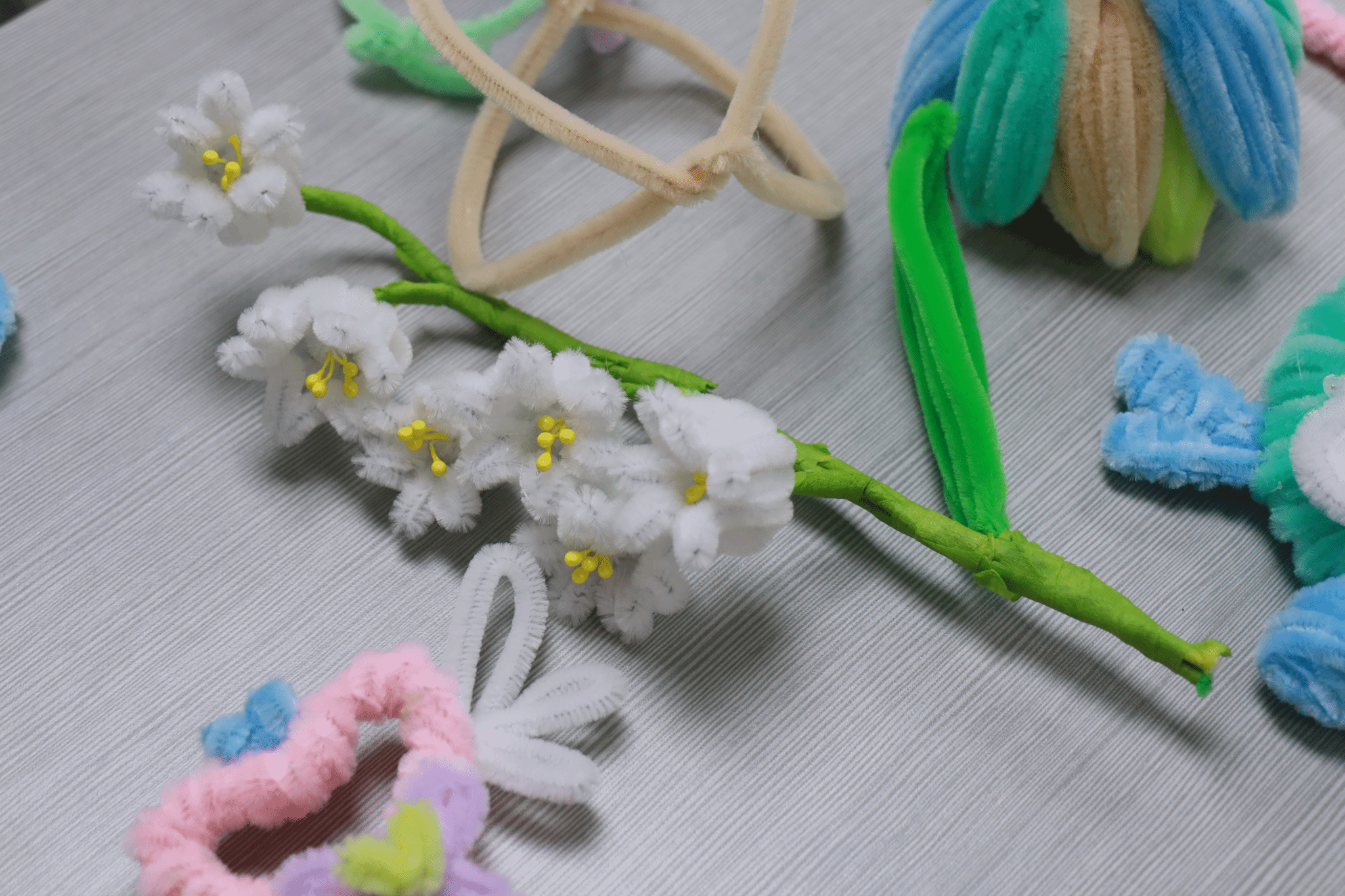 许多同学展现出了惊人的创意和手工天赋。一位同学利用扭扭棒制作了一束灿烂盛开的铃兰花,柔和的线条和明快的颜色让人赞叹不已。另一位同学则巧妙地将扭扭棒扭成了一只冰淇淋,丰富的细节和自然的形态引来众人称赞。