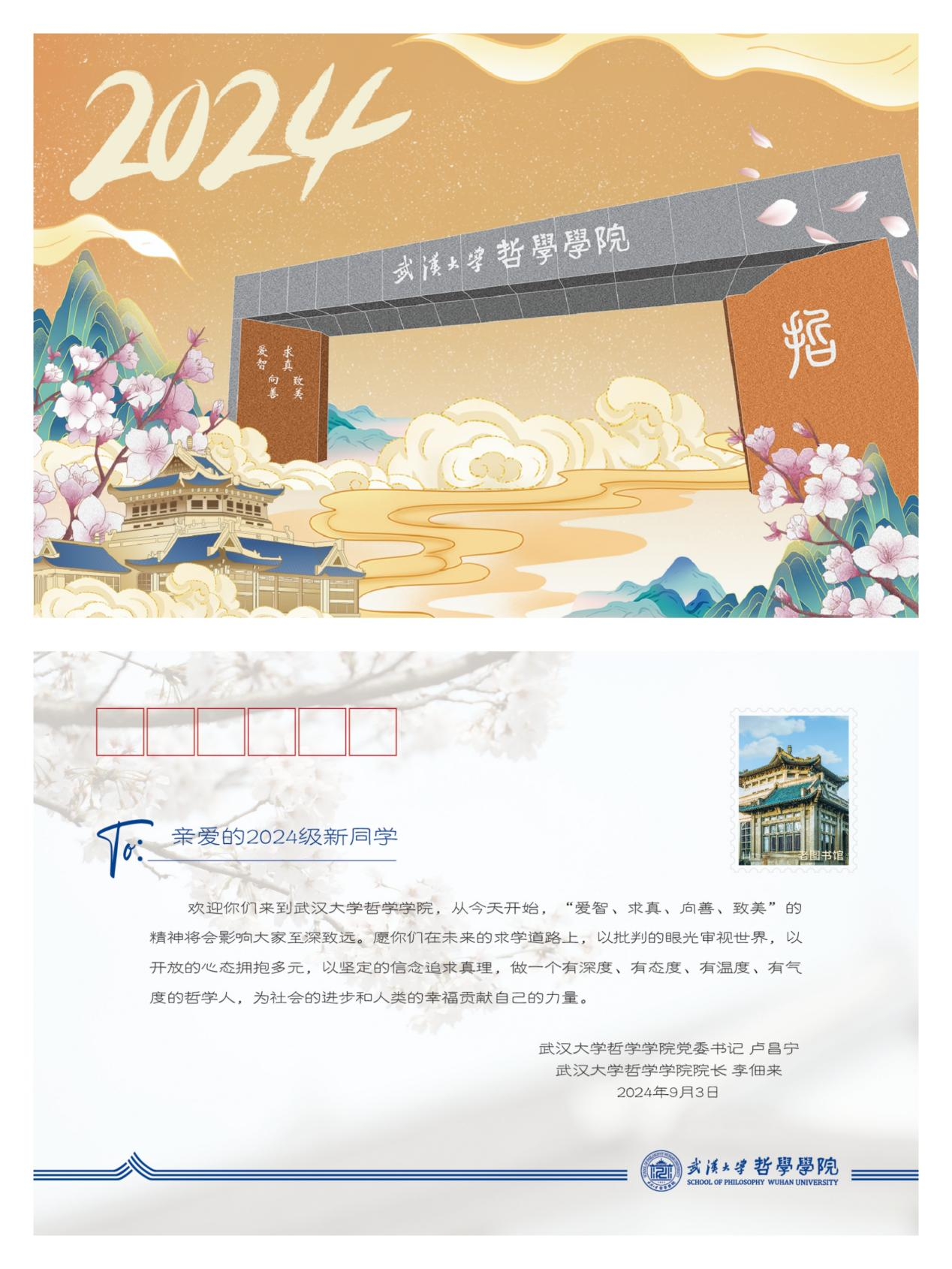党委书记卢昌宁、院长李佃来为新生准备了2024级专属明信片,寄语新生做一个有深度、有态度、有温度、有气度的哲学人,为社会的进步和人类的幸福贡献自己的力量。这一系列贴心的服务,不仅让新生们感受到了家的温暖,更加深了他们对学院的归属感。