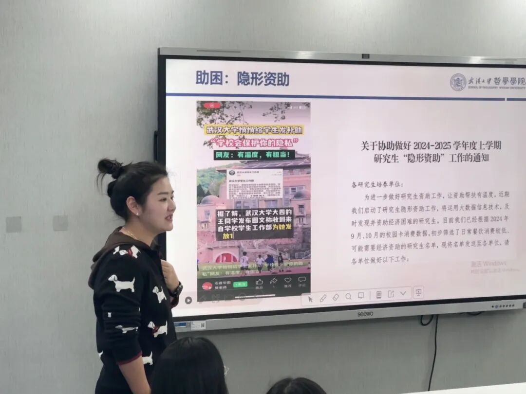 进入 “助困” 环节,代老师围绕 “不让任何一位学子因经济困难影响学业” 的目标,系统讲解国家助学金政策体系,包括研究生日常补贴、家庭经济困难学生认定流程、临时困难补助申请渠道,以及武汉大学特色的“隐形资助”机制。通过这些助困政策,每一位在校学生都能放下心理包袱,传承中华优秀传统文化,筑牢文化传承的学识根基,感受中华精神文明的力量。