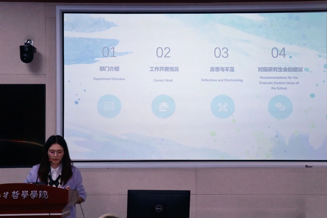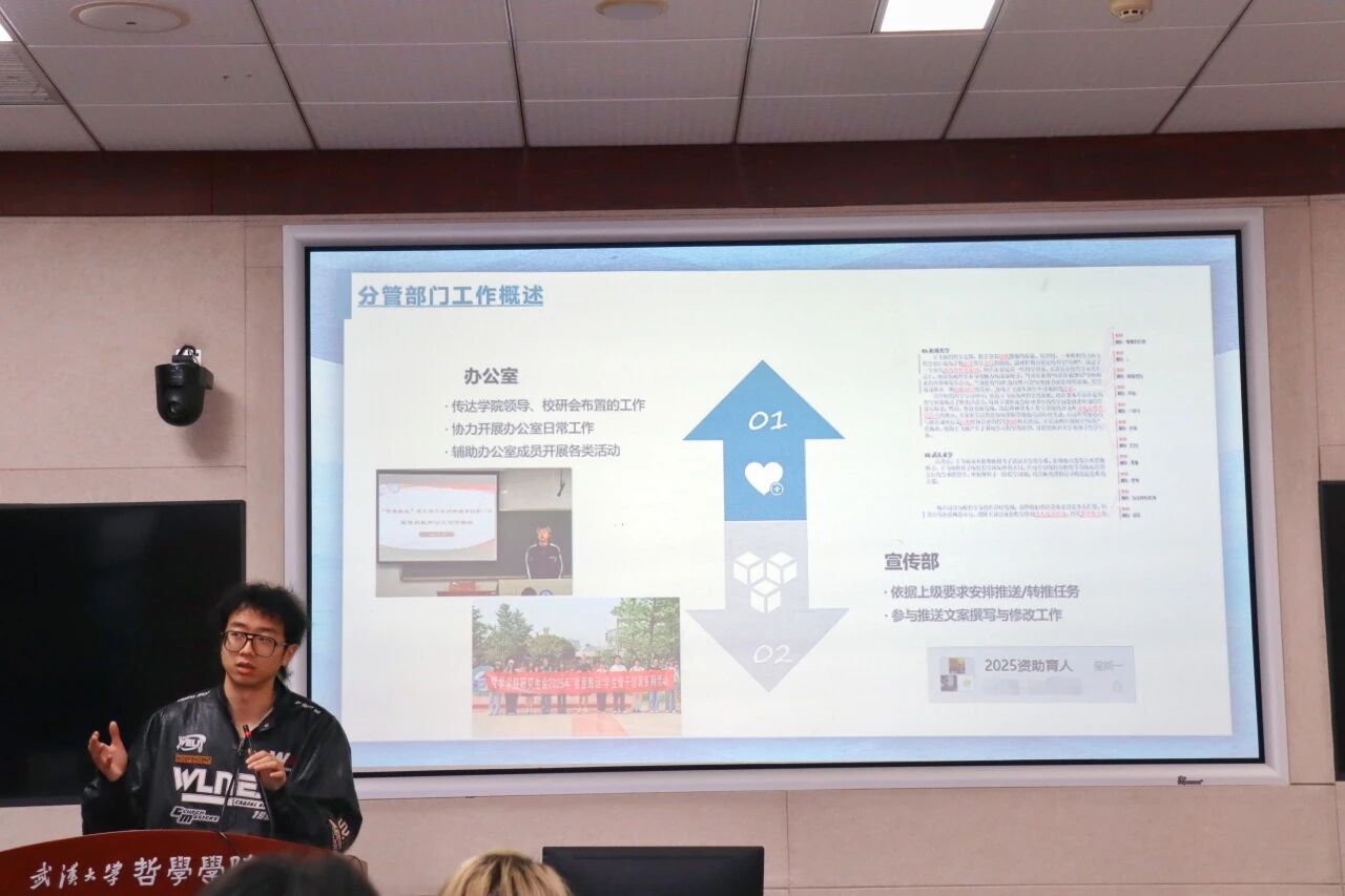 宣传部负责人王伊霖系统介绍了部门在公众号运营、栏目创新与专项宣传方面的工作。她指出,部门持续深耕“武大哲院研究生会”公众号平台建设,成功打造了“哲林新声”等一批具有影响力的品牌栏目,获得了师生的广泛关注与好评。面向未来,她表示宣传部将继续优化宣传流程,提升内容品质,创新呈现形式,以更专业的宣传矩阵全方位展现哲院学子蓬勃向上的精神风貌。