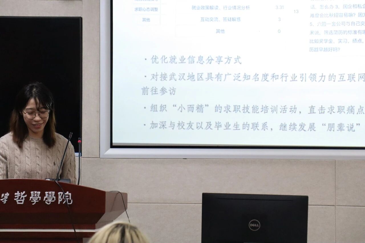 就业实践部负责人周子雯系统汇报了部门在信息收集、技能培训、实习实践三个板块开展的系列活动以及所取得的工作成果。上一学期部门牵头更新了178位博士毕业生信息,组织开展“求职指南针”“职为你来”等就业指导活动,并参与“珞珈职航”暑期实践、山西访企拓岗等实地项目,成果丰硕。针对现有问题,她强调未来将优化就业信息发布方式,开展“小而精”技能培训,加强跨院合作与校友联络,提升就业服务实效。
