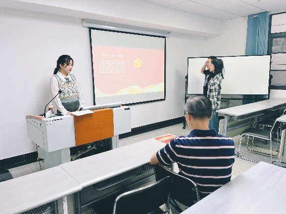 大会第一部分,支部为覃俊辉同志、潘小宁同志两位新党员举行入党宣誓仪式。两位新党员面对党旗高举右拳,第一次以党员身份庄严地宣读入党誓词。督导老师黄超老师分别为两位同志颁发政治生日纪念卡。